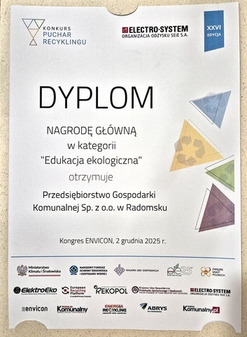 Przedsiębiorstwo Gospodarki Komunalnej w Radomsku zostało laureatem prestiżowego konkursu Puchar Recyklingu w kategorii „Edukacja ekologiczna". Statuetkę wręczono podczas uroczystej Gali 29 Kongresu Ochrony Środowiska ENVICON, która odbyła się 3 grudnia w hotelu Vienna House Andel's w Łodzi. To wielki zaszczyt i szczególne wyróżnienie w branży. Można uznać, że zespół naszego Działu Ochrony Środowiska, który realizuje działania edukacyjne to najlepsze edukatorki ekologiczne w Polsce. Jak powiedział prezes Zbigniew Rybczyński odbierając wraz z kierownikiem Działu Urszulą Rylik: "działania prowadzone przez zespół pracujący w Dziale dodają wartość funkcjonowaniu całej spółki, a dzięki temu, że trafiają w wielu przypadkach do młodego lub bardzo młodego odbiorcy, dają realne podstawy do kształtowania świadomego, dbającego o ekologię, prawdziwego opiekuna naszej planety"